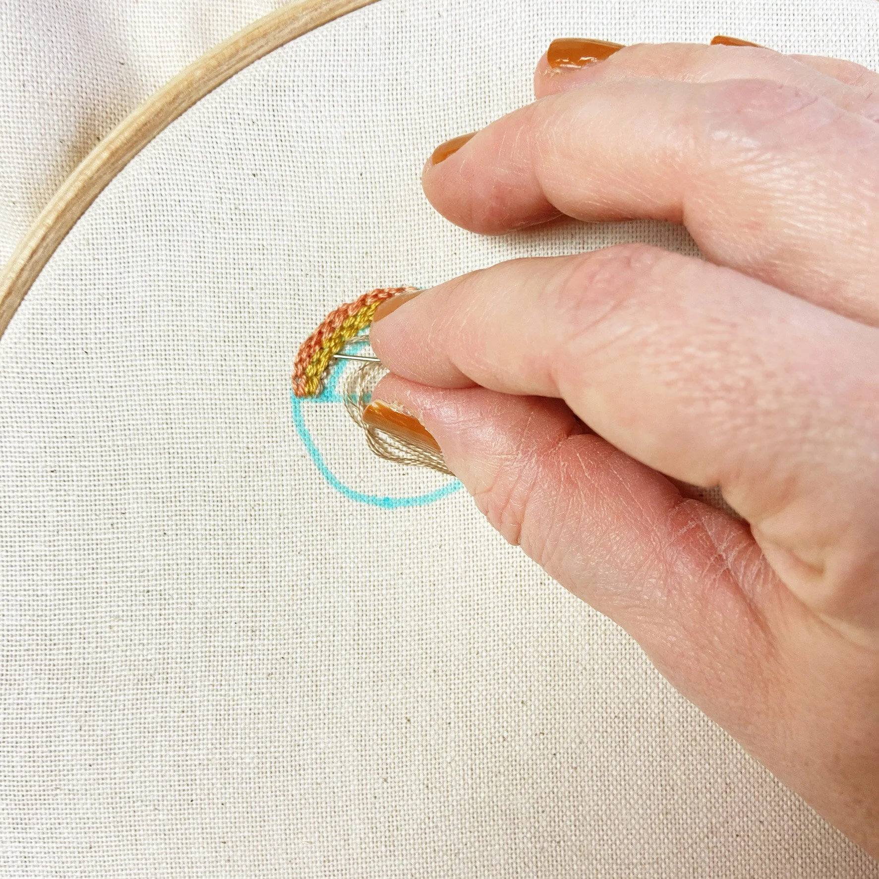 Coming up from the back of the fabric at the point you would like your fringe to start, loop the thread around and put your needle back into the fabric just to the left of where you have come up. Do not pull your thread all the way though but instead leave a loop of thread sitting on the top of the fabric, bring the thread back through the fist hole you created and create a straight stitch over both threads to secure. Continue in this way until you have all of the fringing you require. Brush the thread flat and trim with sharp scissors. Where the fringing overlaps, create the colour you want on the top first and then create the fringing of the second colour underneath.
