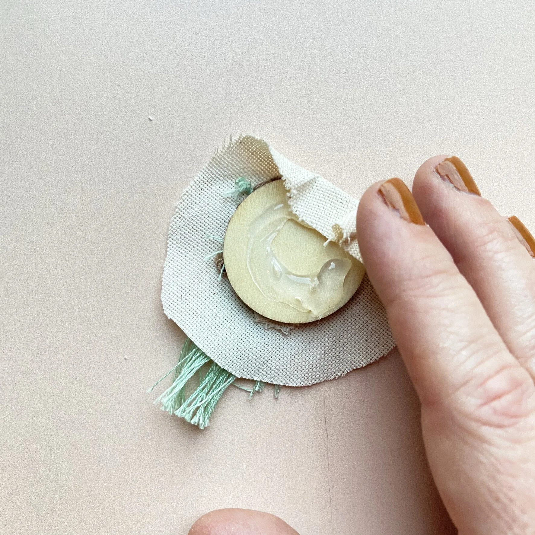 To mount your necklaces in their frames cut around each hoop leaving a boarder of fabric of 1.5cm. Place you design face up onto the smallest flat wooden piece wrap the excess fabric to the back and glue using a glue gun or fabric glue. Place your design into the hoop and tighten the clasp at the top until it feels secure. Glue the larger wooden circle onto the back of the hoop to hide and protect the back of the stitching.
